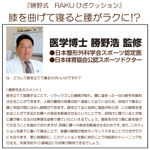 3個以上で送料無料!あす楽OK!ひざクッション | 勝野式 RAKUひざクッション ひざを曲げて寝ると腰がラクなんです ※当ウェブサイトに掲載されているコンテンツ(文書、画像、映像等)は、著作権法、関連条約・法律で保護されています。